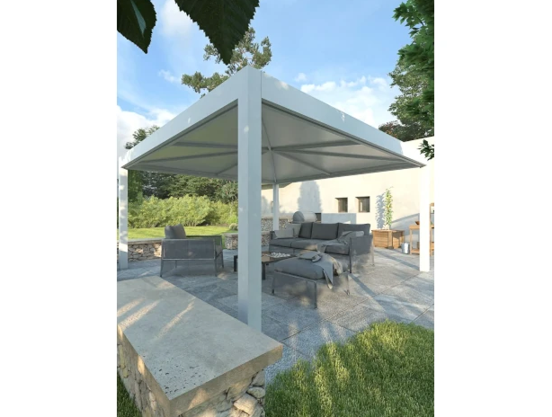 Grazie alla struttura portante in acciaio zincato (optional verniciatura) e alla copertura piramidale in membrana tessile di alta qualità, GIZA Minimal offre una protezione efficace da sole, pioggia, neve e vento forte. La sua resistenza alle intemperie lo rende adatto sia per l’uso residenziale che professionale.