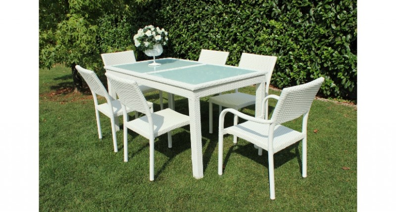 Tavolo Ibiza allungabile con struttura in alluminio, rivestimento in wicker con materiale UV protection. Piano del tavolo in vetro di colore nero spessore mm 5.